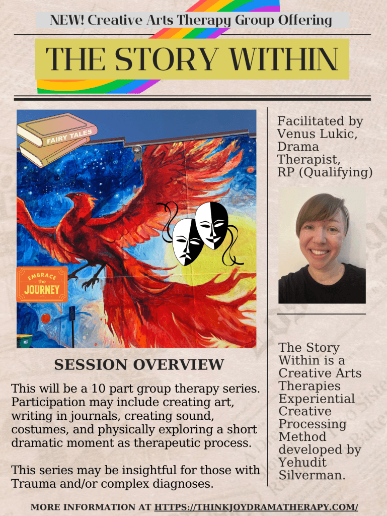 The Story Within is a group therapy series combining Dramatic and other arts based expression with Narrative Psychotherapy. This group therapy series is a multi-part therapeutic process using creative exploration revolving around the story of a mythical or fictional character.